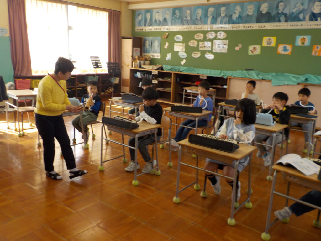 1・2年生の音楽では、鍵盤ハーモニカでド~ソの中で自分が選んだ3つの音を演奏し、リレーで友だちにつないでいきました。ドレミ⇒ミレド⇒ドミソ⇒ミファソなど、音がどんどんつながって、みんなでリレーすることができました。