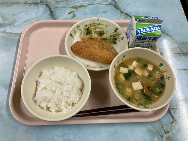 ご飯、胡麻味噌汁、鮭チーズフライ、五色漬け、牛乳 でした。