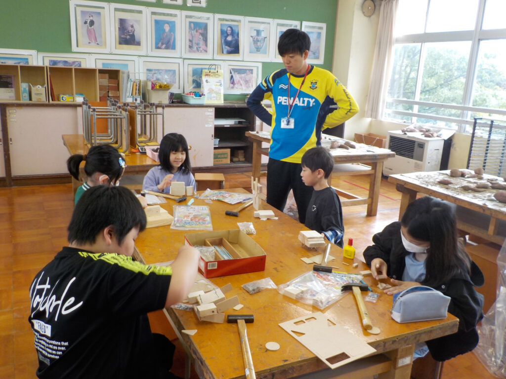3年生は、図画工作で木切れを釘で組み立てて自分のイメージしたものをつくっていました。イメージに合わせて木を切ったり、釘の大きさを使い分けたりしながら、工夫して作品を仕上げていました。カニやペンギンなどの特徴がよく表現された作品ができあがってきました。
