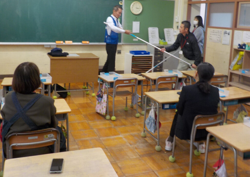 不審者対応の避難訓練のために、職員研修を行いました。警察OBのスクールサポーターから、学校への不審者侵入の現況や対応の基本について教えてもらいました。いざというときでも落ち着いて、刺激せず、距離を取ることが大切だとわかりました。