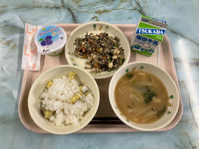 さつまいもご飯、大根の味噌汁、卵入り炒り豆腐、ブルーベリーゼリー、牛乳 でした。
