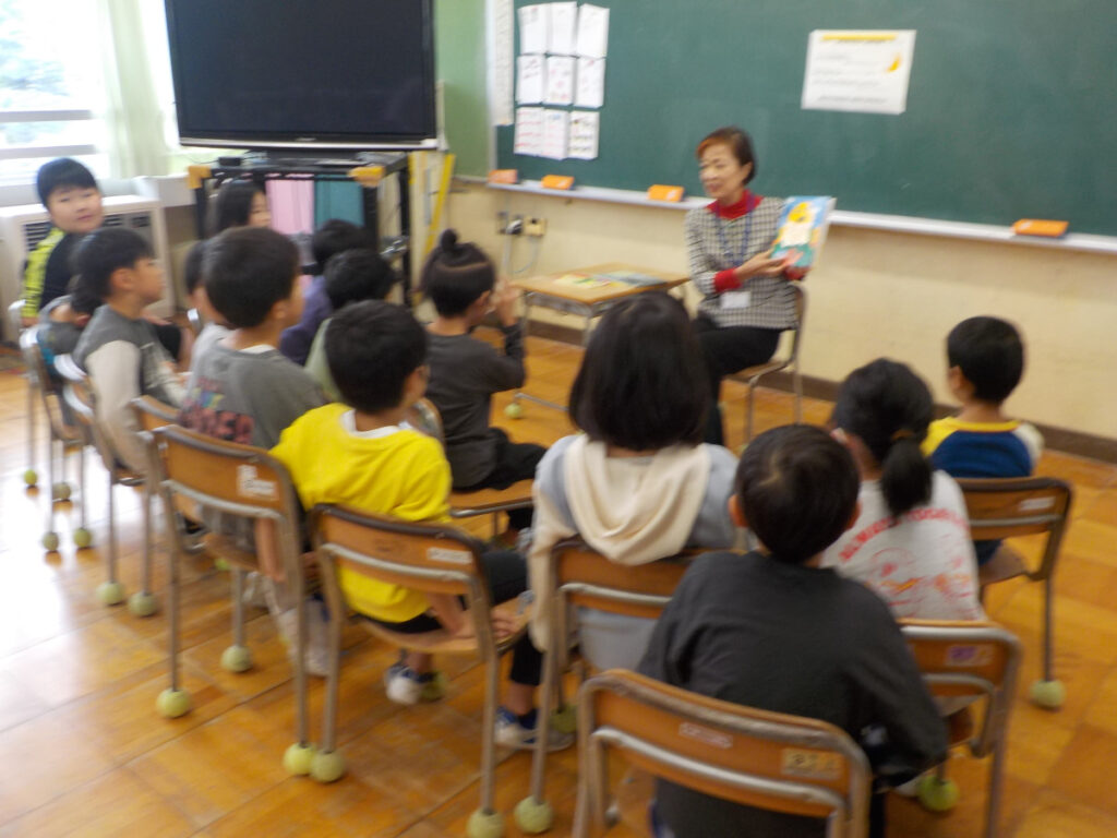 「がらがらどん」さんの読み聞かせでは、1・2・3年生は「ないた」などの絵本をよんでもらいました。