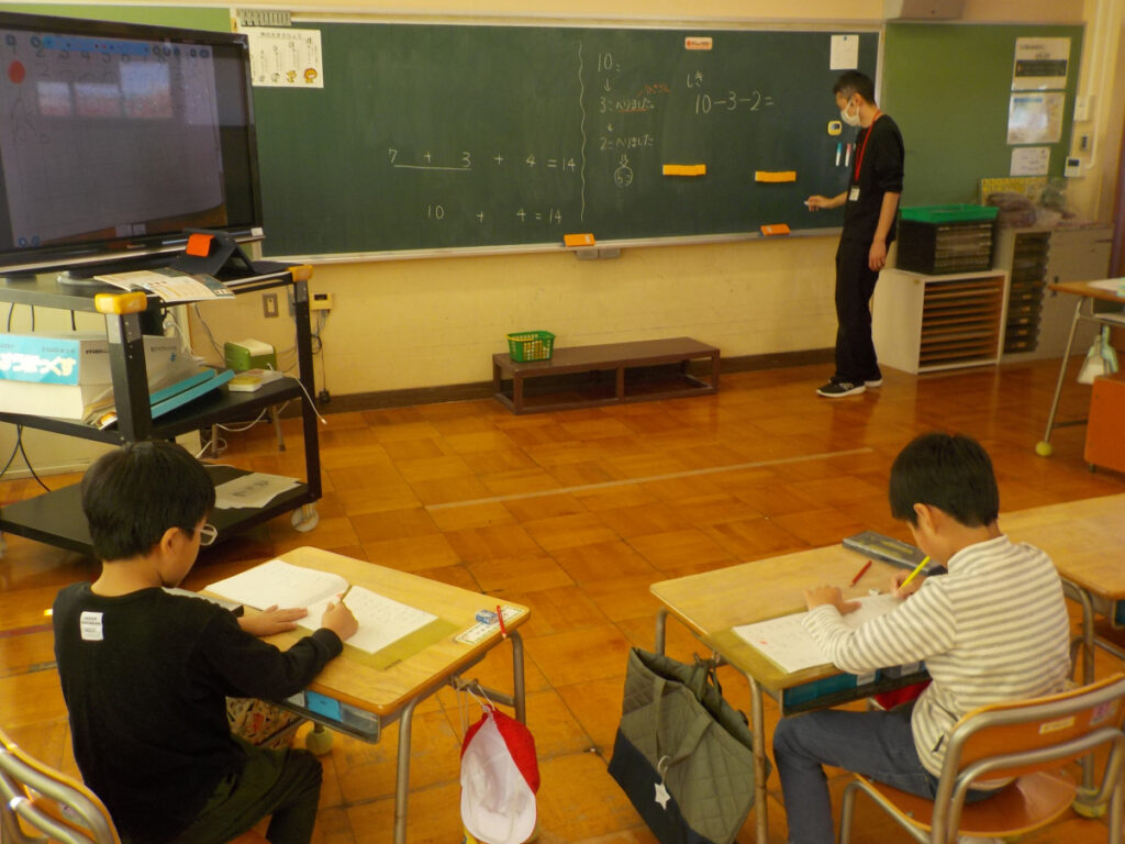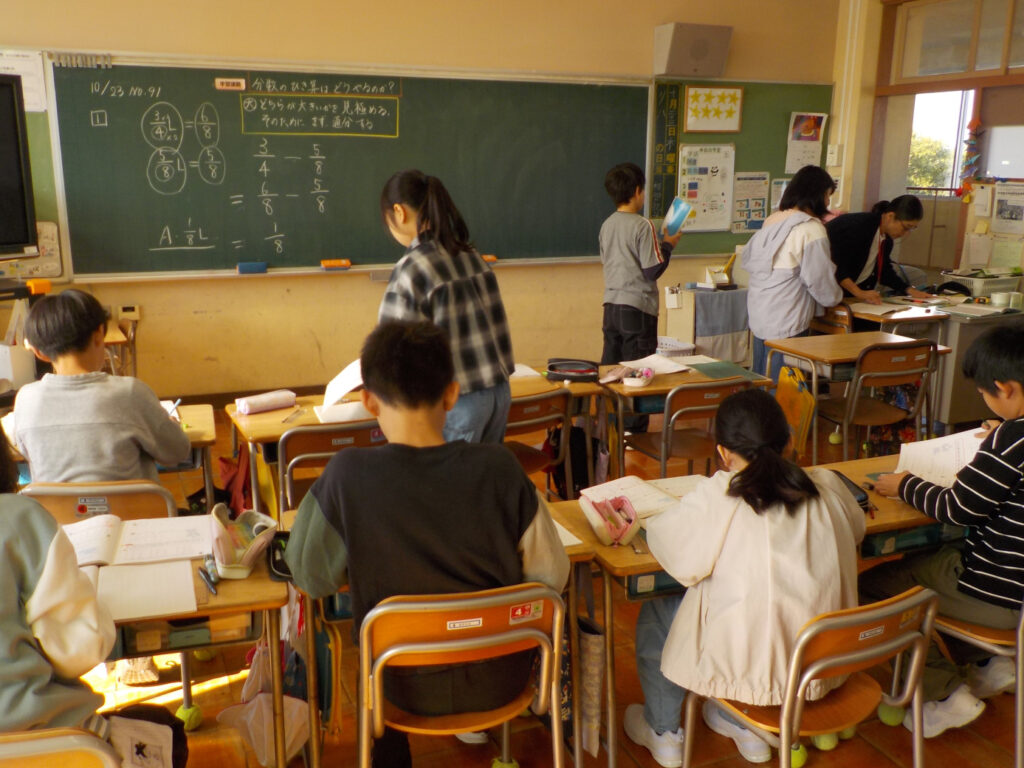 5年生は算数で、分数の引き算をしています。分母が異なると計算できないので、分母をそろえるための通分をします。うまく通分して、正確に計算できたかな?