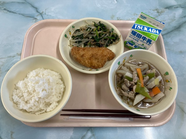 ご飯、のっぺいじる、アジフライ、菊漬し、牛乳 でした。