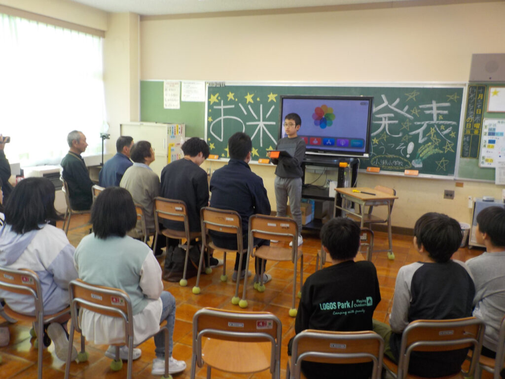 5・6年生が、総合「米こめワールド」で調べてきたことをまとめて、発表会を開きました。今までの学習活動でお世話になった方々をお招きして、米や米づくりについて調べたことをプレゼンしました。そして、最後に、学校田でつくったお米をプレゼントしました。参加された方々は、発表にやお米のプレゼントに大変喜んでくださいました。充実した発表会になりました。