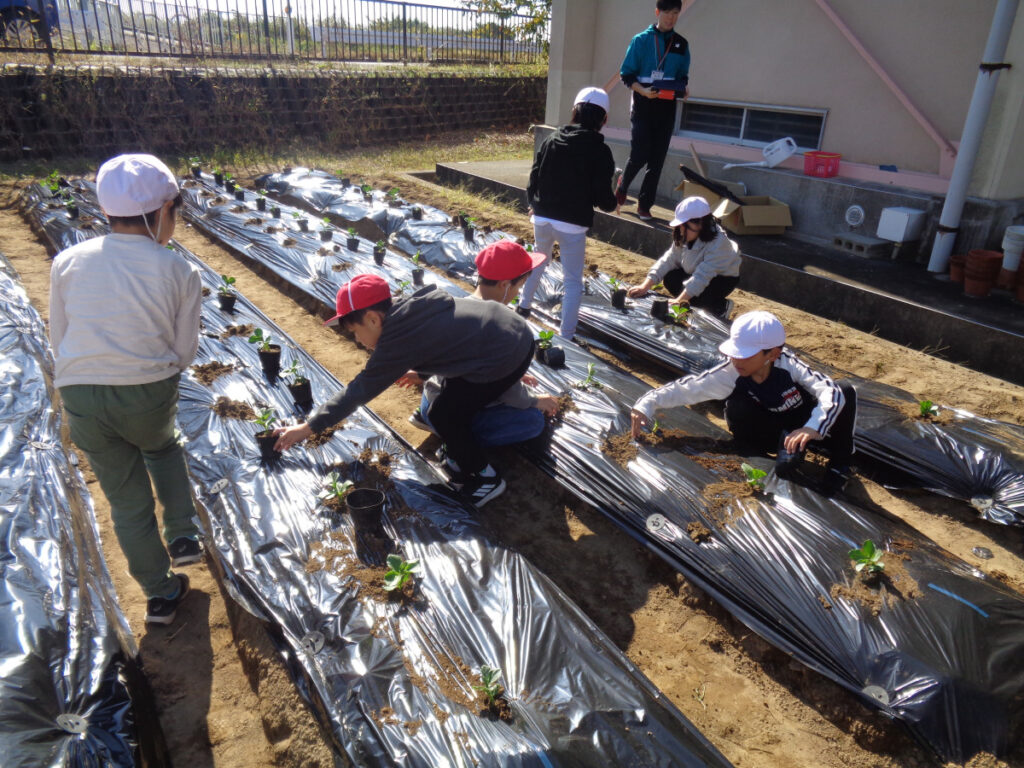 10月30日(木) 2年生がそら豆を植えました。地域の方から植え方を教わり、マルチをかけた畑に植えました。冬を越して、しっかり成長してまた多くのそら豆が実ってほしいです。