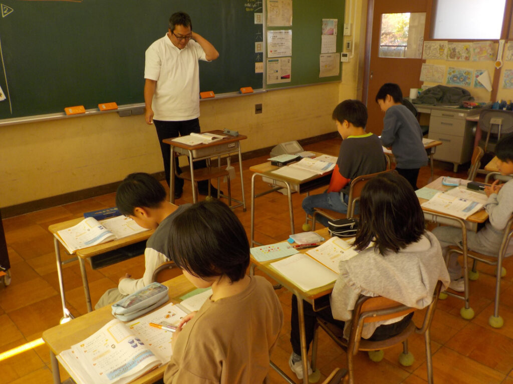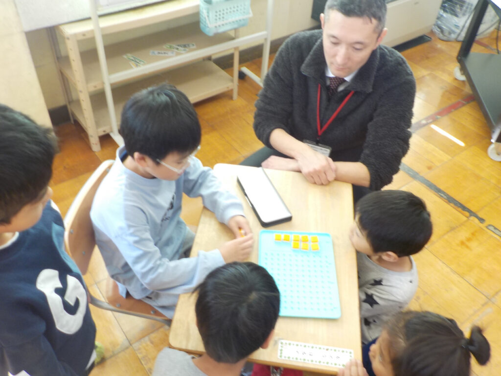 1年生は算数で、繰り上がりのある足し算を学習していました。8+3のやりかたをブロックを使って考え、自分のやり方を説明して、みんなで聞き合っていました。