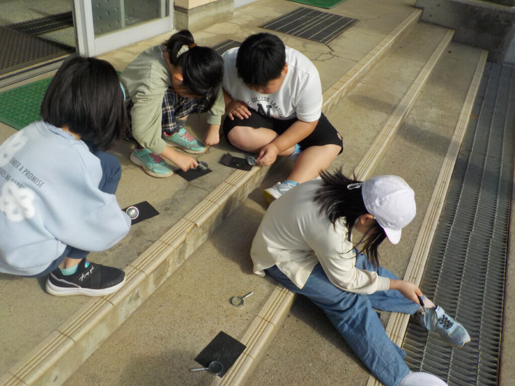 3年生は理科で、虫眼鏡で日光を集めて、黒い紙を燃やす実験をしていました。太陽が雲に隠れるので、タイミングを見計らって実験していました。小さい虫眼鏡よりも大きい虫眼鏡のほうが速く燃やすことができることを見つけていました。
