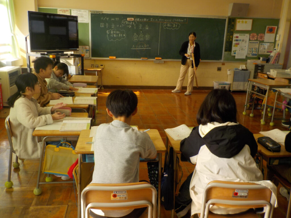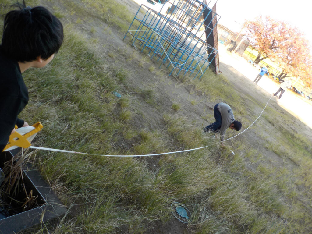 6年生の算数では、影の長さから校舎の高さを求めていました。グラウンドで校舎の影の長さを測り、比を活用して校舎の実際の高さを求めます。うまく算出することはできたかな?