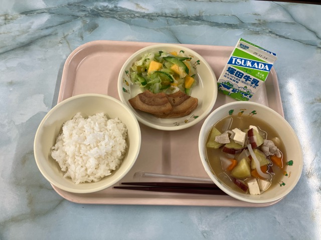 ご飯、地場もん自慢汁、車ふの揚げ煮、柿入りフレンチサラダ、牛乳 でした。