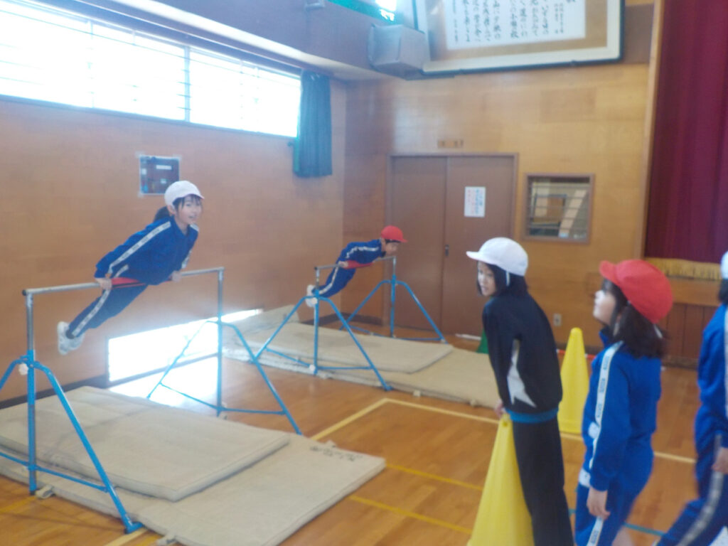 昨日の放課後、職員で鉄棒を体育館に出しました。今日から、体育で鉄棒の活動が始まりました。最初は、1・2・3年生です。鉄棒のカードに示された技ができるかチャレンジしました。カードの技をみんなクリアできるかな?