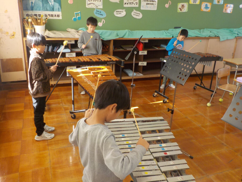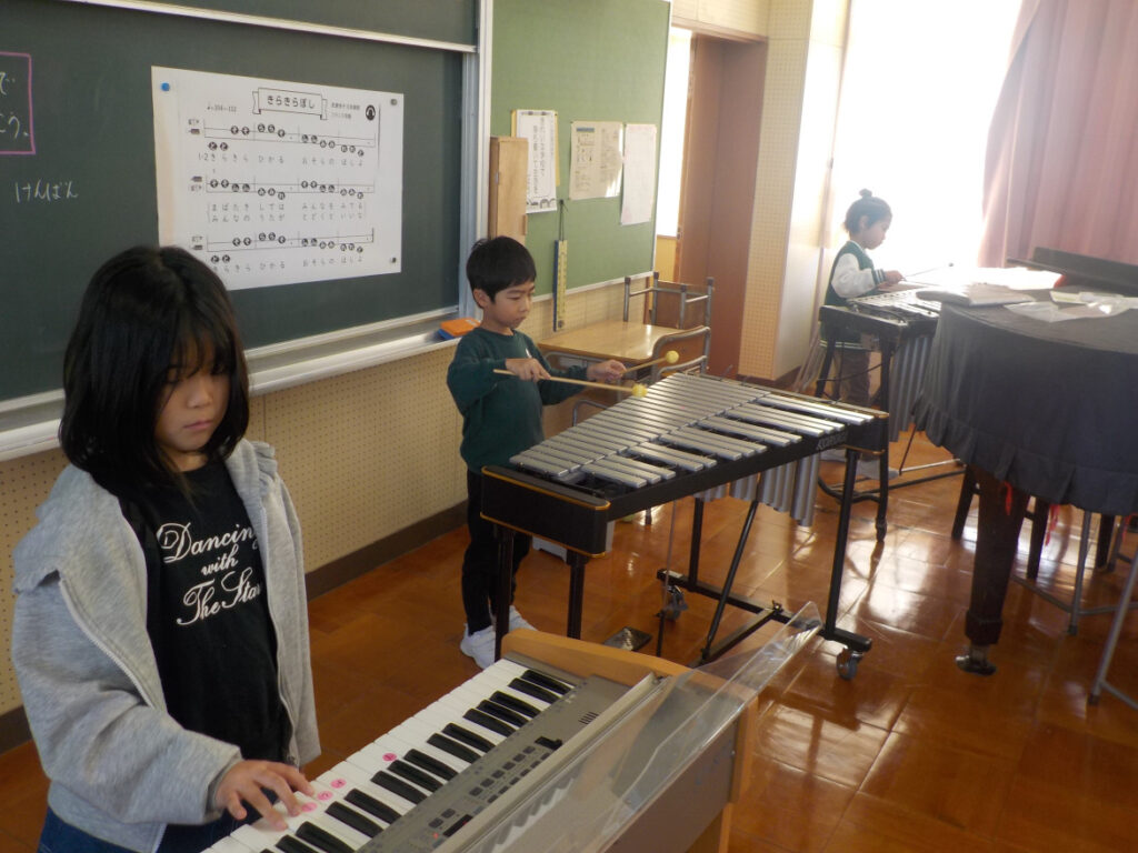 1・2年生は、音楽で「きらきらぼし」を合奏していました。鍵盤楽器や木琴、鉄琴などを順番に回りながら、いろいろな楽器で「きらきらぼし」を演奏します。どの楽器になっても、他の人とうまく演奏を合わせることができたかな?