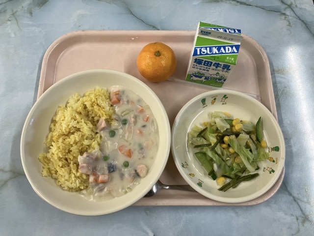 カレー味ご飯、サーモンのクリームソース、茎わかめのサラダ、みかん、牛乳 でした。