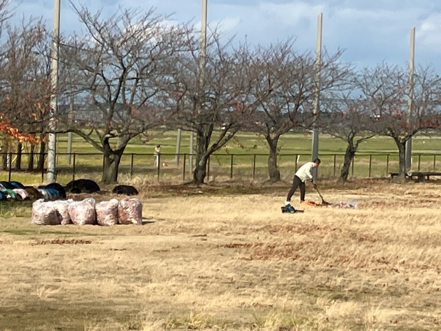 グラウンドの桜の葉がすっかり落ちてしまいました。用務員が落ち葉を掻いて集めています。たくさんの落ち葉が袋に集まっていました。いよいよ冬の到来でしょうか?