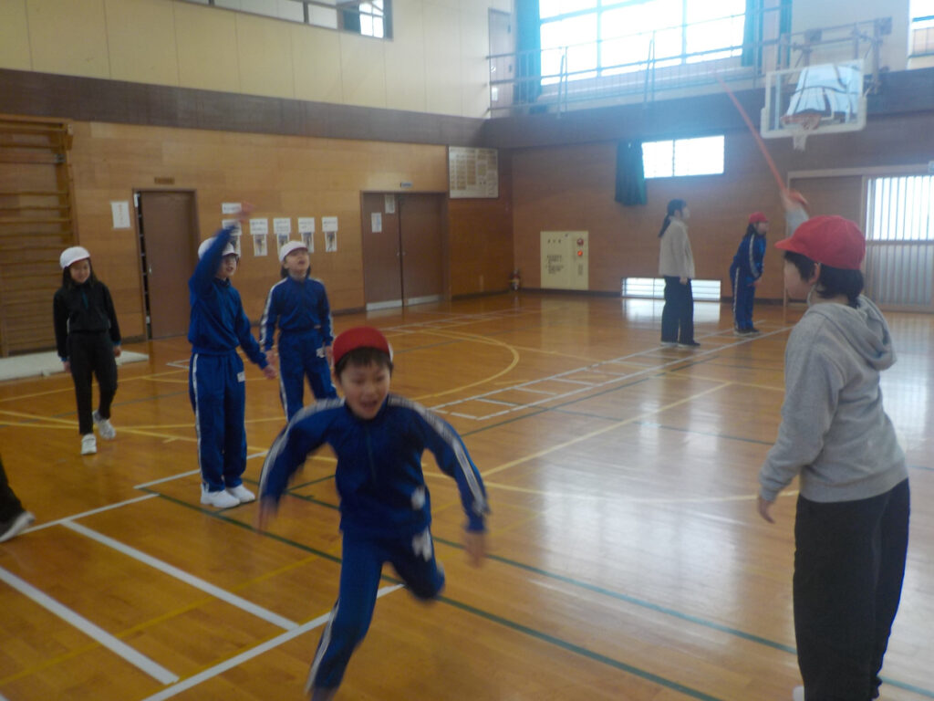 5・6年生の体育では、大学から来ている学習支援ボランティアの先生が、学習のサポートをしていました。鉄棒をする子どもたちと一緒に前回りにチャレンジしていました。
