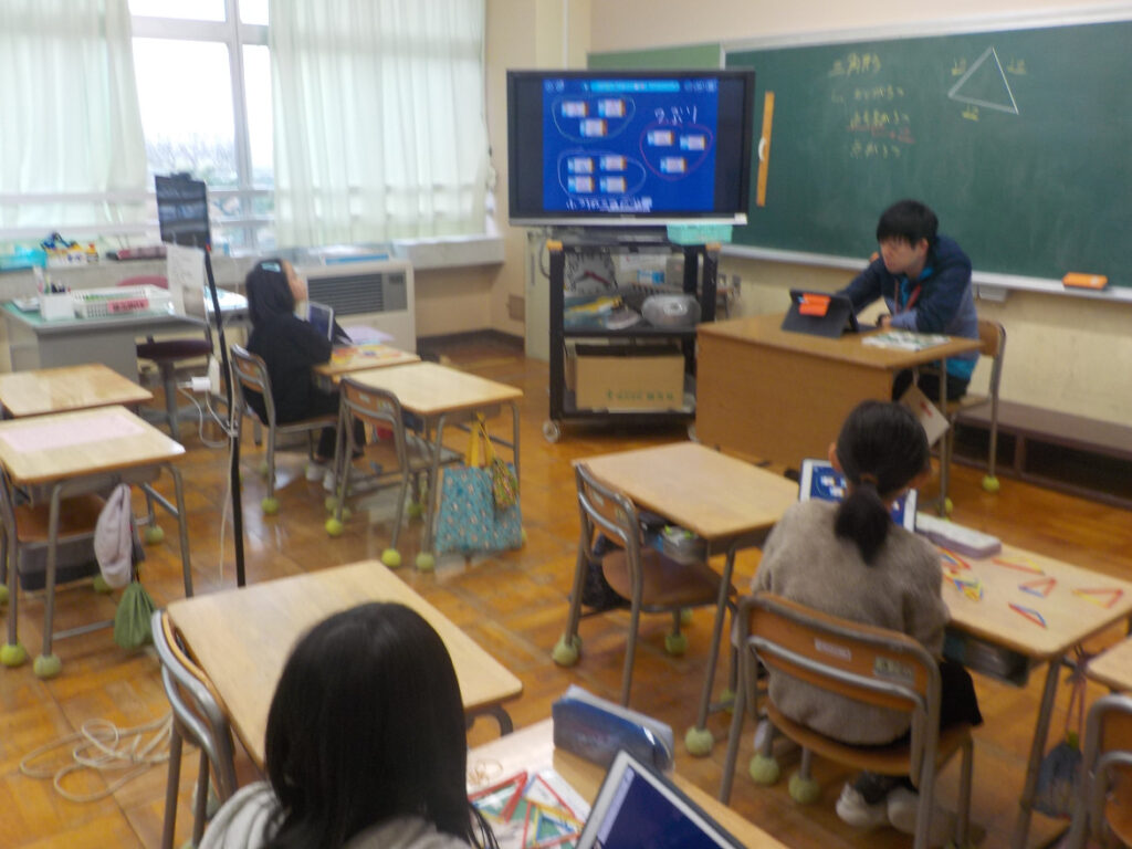 3年生は算数で、三角形を作って仲間分けしていました。3種類の棒を組み合わせて三角形を作ります。できた三角形を形に着目して仲間に分けました。分けたグループに「ふつうのさんかく」「とんがりさんかく」などのネーミングをしました。他の人の分け方を聞いて、意見を伝え合っていました。