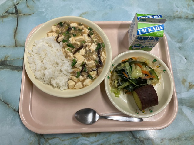ご飯、マーボー丼の具、中華サラダ、ふかしいも、牛乳 でした。