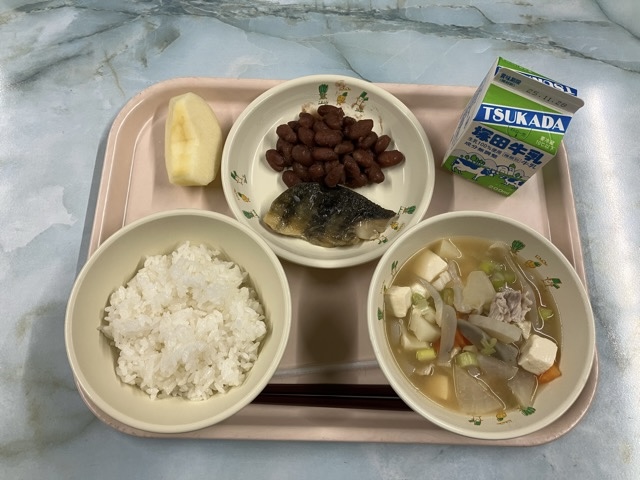 ご飯、豚汁、ほっけの塩焼き、金時豆の甘煮、りんご、牛乳 でした。