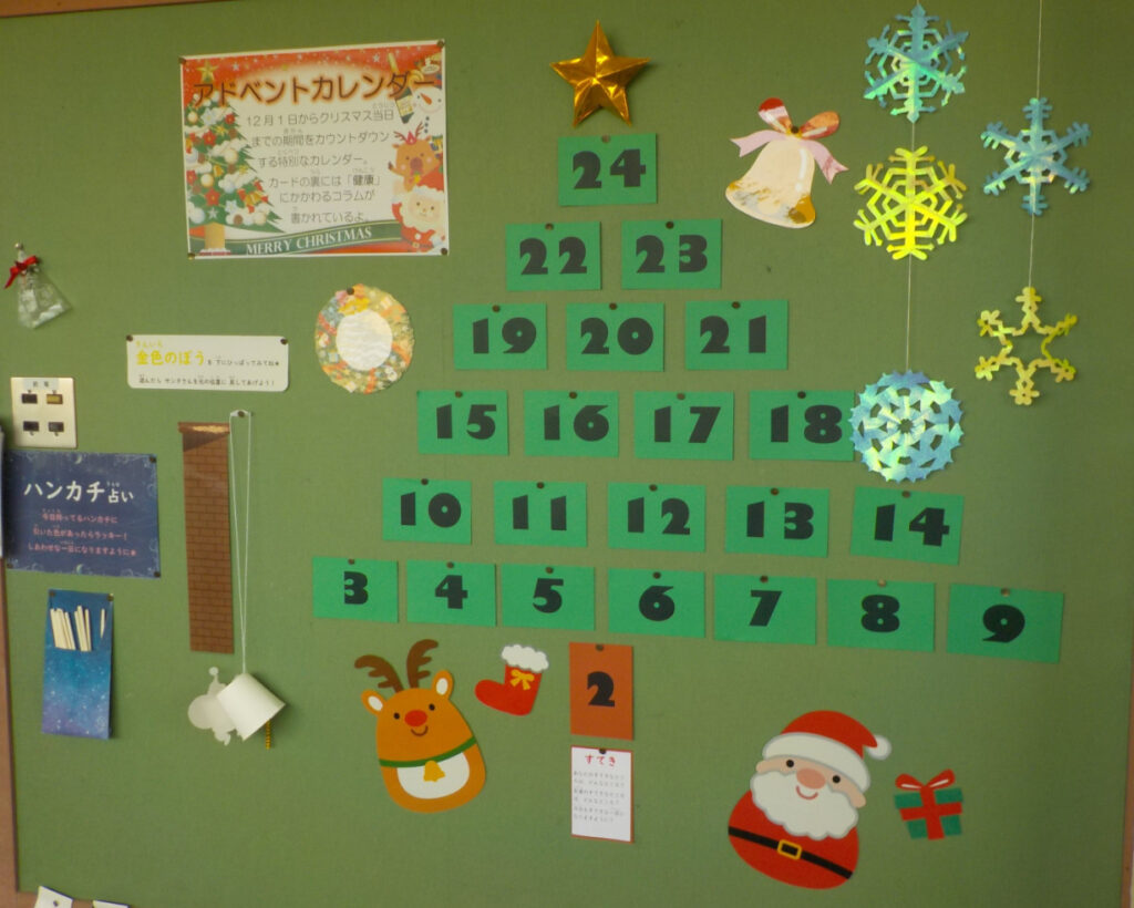 保健室前にもクリスマスツリーが登場しました。今日からクリスマスまで、カウントダウンが始まり、毎日1つずつのコラムがオープンになっていきます。今日は「すてき」。「あなたのすてきなところは…」自分の、友だちの「すてき」をたくさん見つけていけるとよいですね。