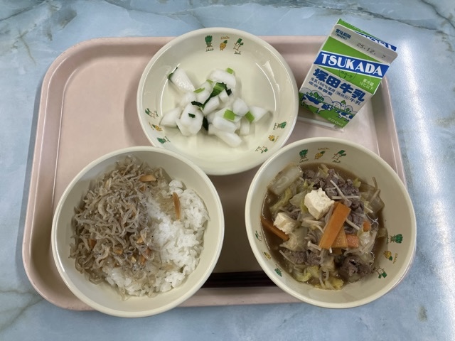 ご飯、すきやき、アーモンド入りちりめんじゃこの佃煮、カブ漬け、牛乳 でした。