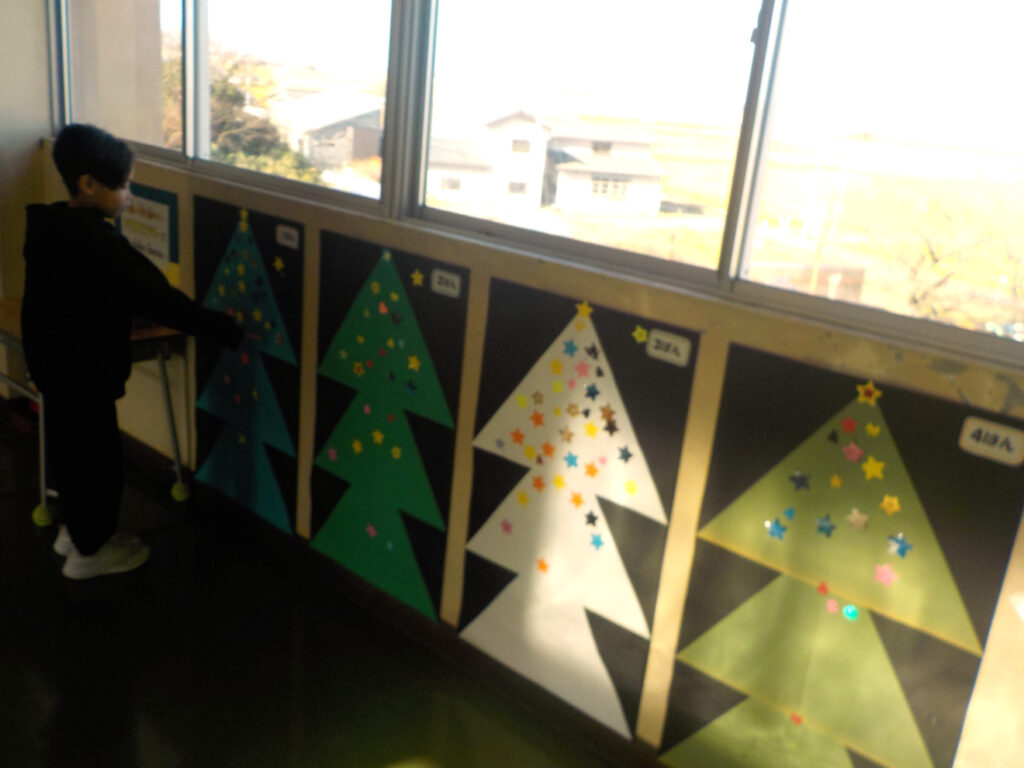図書館では、1年生が本を選んでいました。読んだ本に合わせてもらったシールをカードに貼ったり、廊下のクリスマスツリーに星を貼ったりしていました。