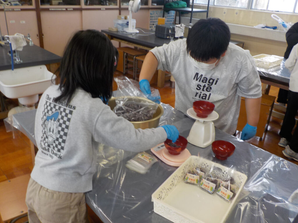3年生は、総合で育てたそら豆を甘納豆にしてもらい、一袋の個数や重さを測りながら、みんなで協力して袋詰めしました。5日の小瀬っ子祭りのときに販売します。たくさんの人に買ってもらって、美味しく食べてもらえるとよいですね。