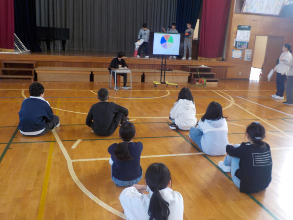 昼休みに、小瀬っ子祭りのリハーサルが体育館で行われました。抽選で当たるいろいろな〇〇券のくじ引きが行われました。ルーレットで学年が決まり、学年の袋から当選番号が決まります。当日はだれが当選するでしょうか!?
