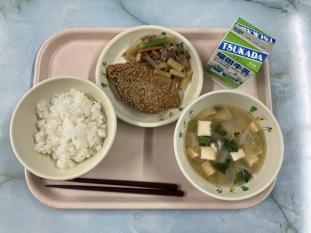 ご飯、大根と生揚げの味噌汁、サバのゴマ揚げ、野菜のきんぴら、牛乳 でした。