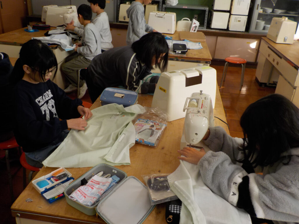 5・6年生は家庭科で、エプロンづくりをしていました。いよいよミシンがけで仕上げていきます。その前のしつけ縫いで苦戦している人もいました。ミシンがけが終わったら、気持ちよくしつけをスゥーっと抜くことができるとよいですね。