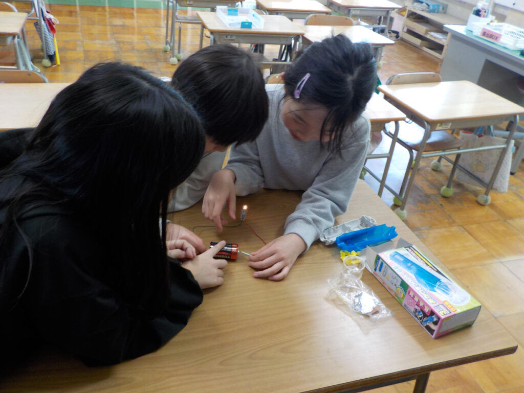 3年生は理科で、回路の中に何かを挟むとあかりはどうなるのか(つく?つかなくなる?)を調べていました。釘を挟んだり、プラスチックを挟んだりしながら、回路になるもの、ならないものは何かを確かめていました。