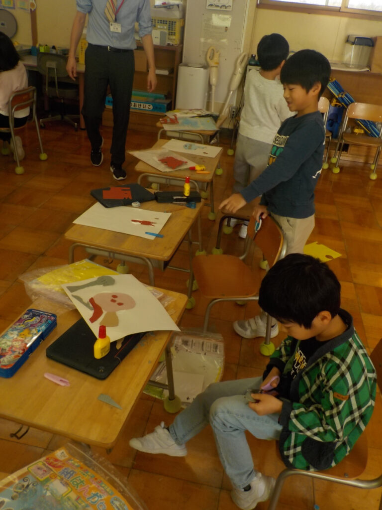1・2年生は図工で版画の版を作っていました。いろいろな素材を自分が表したいイメージに切って貼っていきます。素材の表面の凹凸を生かした楽しい版画になりそうです。