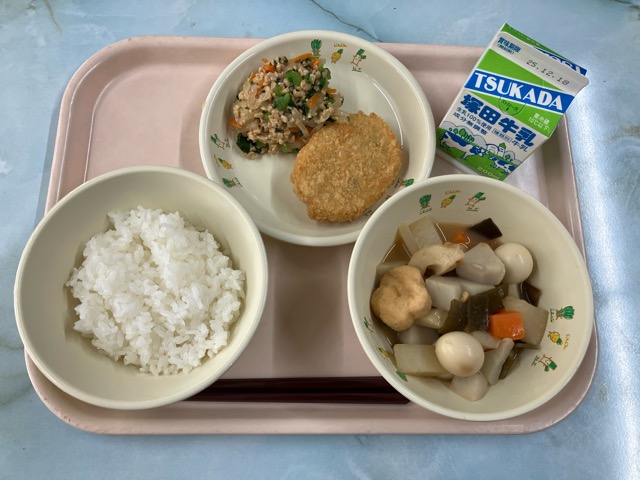 ご飯、うずら卵入り味噌おでん、かぼちゃコロッケ、きりざい、牛乳 でした。