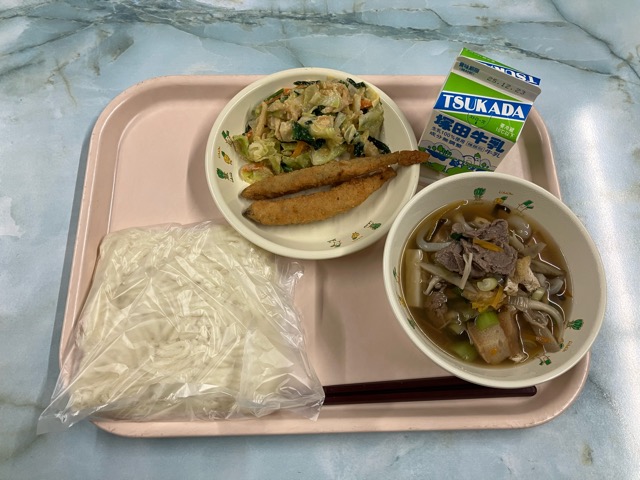 ゆでうどん、十三汁、ししゃもフライ、アーモンド和え、牛乳 でした。
