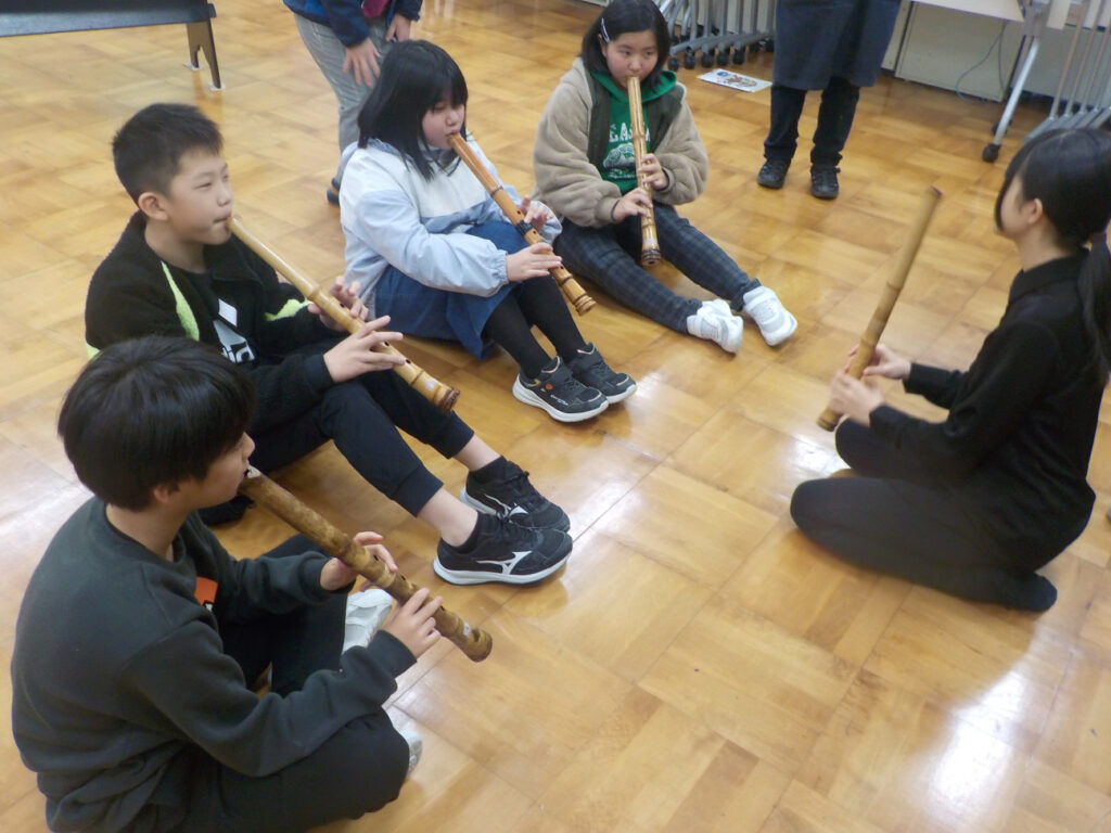 尺八は今回が初めてで、音を出すのに一苦労。また、何回も吹いていると酸欠状態に…。でも、みんなあきらめずにチャレンジしていました。