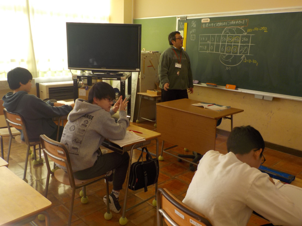 6年生は、比例を用いて、250mLのコーラの中の砂糖の量を求めていました。「100mLと150mLのときの砂糖の量を足す」「50mLの5倍だから砂糖も5倍する」「1mLのときの砂糖の量を求めれば、コーラがどんな量でも出せる」などの意見が出されました。比例の考えを上手に生活に用いることができるとよいですね。
