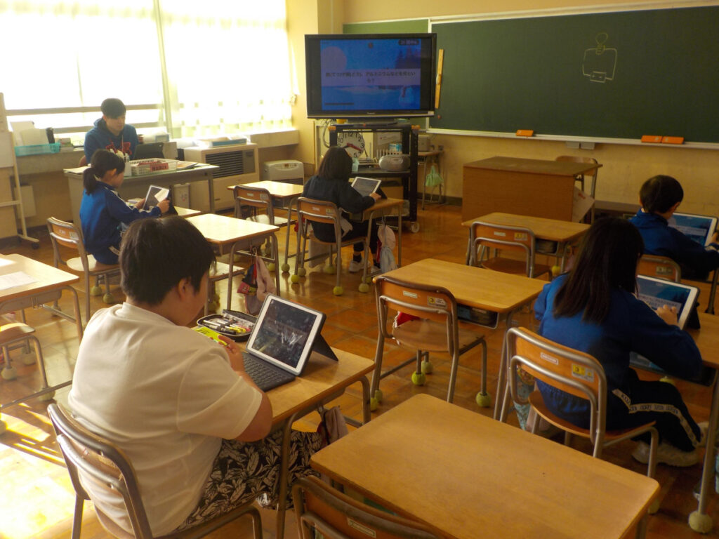 3年生は、「明かりをつけよう」のまとめをしていました。プリントで今まで学習したことを確かめ、タブレットを使って出される問題に答えていく「Kahoot!」をして、復習をしていました。