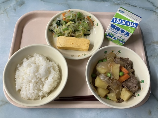 ご飯、肉じゃが、厚焼き卵、五色漬け、牛乳 でした。