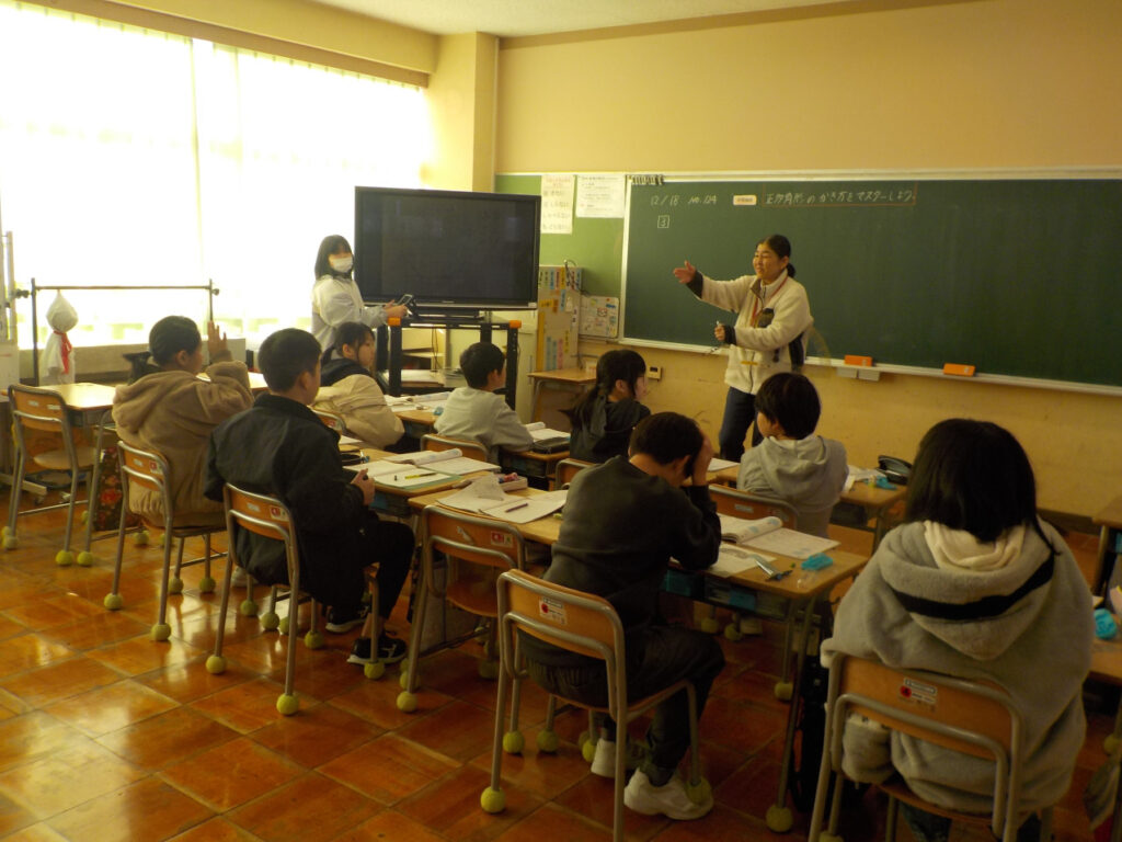 5年生は算数で、正多角形を描く学習をしていました。「外周を角度を測りながら描いていく」「中心から対角線を角度を測って描いていく」、「円を描いて対角線を描いて長さを測る」という、教科書の3つの方法から自分ができそうな方法を選んで、正八角形を描きました。それぞれのやり方を発表したり、他の人のやり方を聴いたりして、考えを深めました。