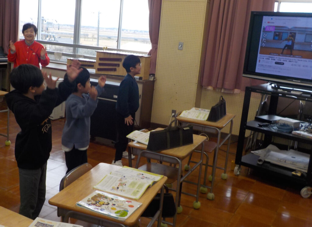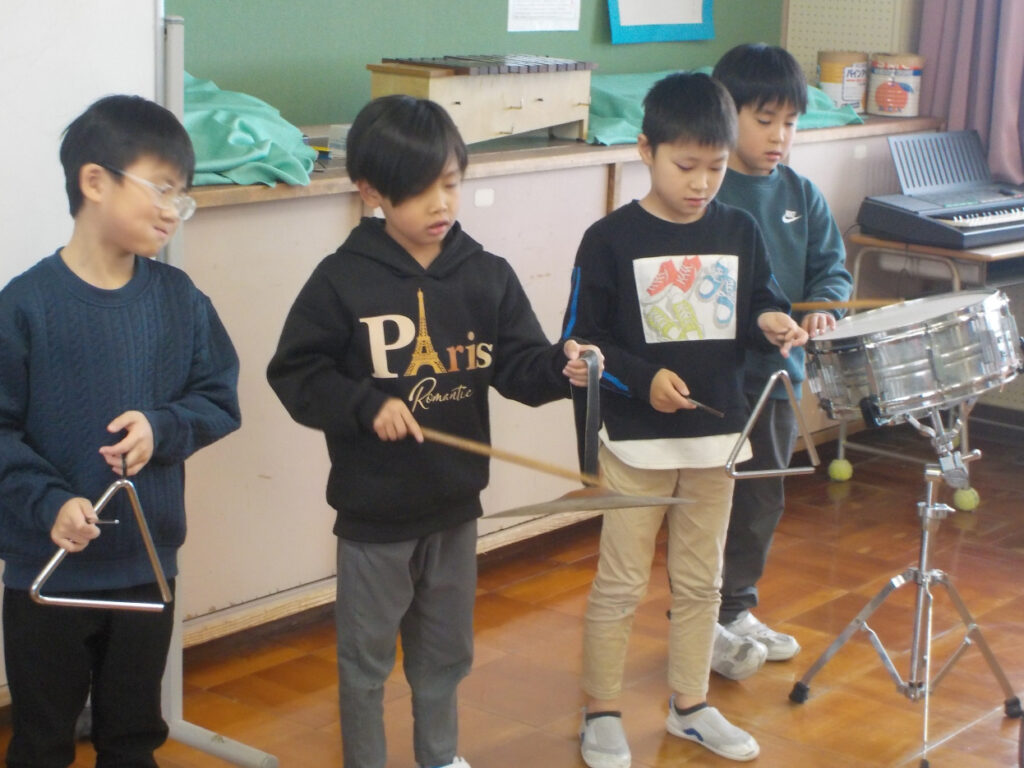 1・2年生は、一人一人が楽器を選んで、3つ叩くリズムをグループでタイミングよくつなげていくようにしていました。グループができたら、全員でつなぐこともしました。また、クリスマスが近いので、クリスマスソングに合わせたダンスもしていました。