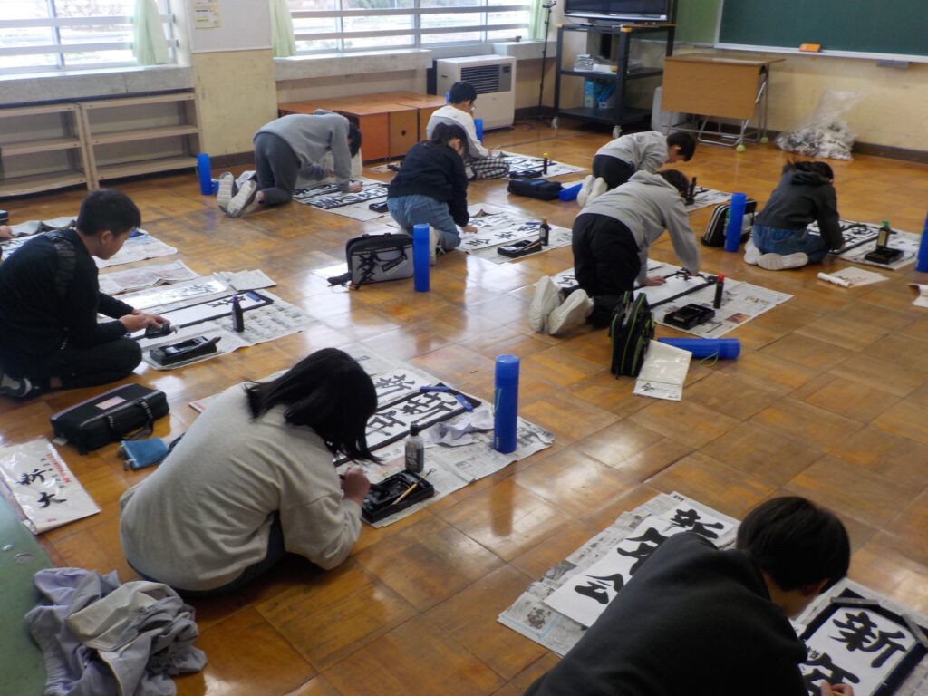 5・6年生の教室からは、墨の香りがしてきます。みんな集中して、静かに書初めの文字を書いていました。;最初に比べて、ずいぶん形が整ってきました。コンクールがあるので、どんどんチャレンジしてほしいです。