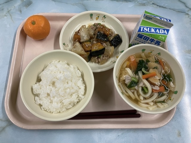 ご飯、うどん汁、カボチャとカブのそぼろあんかけ、みかん、牛乳 でした。