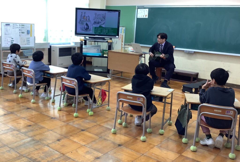 1年生の図書の時間に、校長が「どろんこハリー」の読み聞かせをしました。前回は、タブレットがうまく動かなくなって中断してしまいました。それで、再チャレンジです。前回歌った「どろんこハリーの歌」をみんなよく覚えていて、話の途中途中に出てくる歌を一緒に楽しく歌いながら、読み進みました。終わった後、シリーズの本を借りようとしている子もいました。