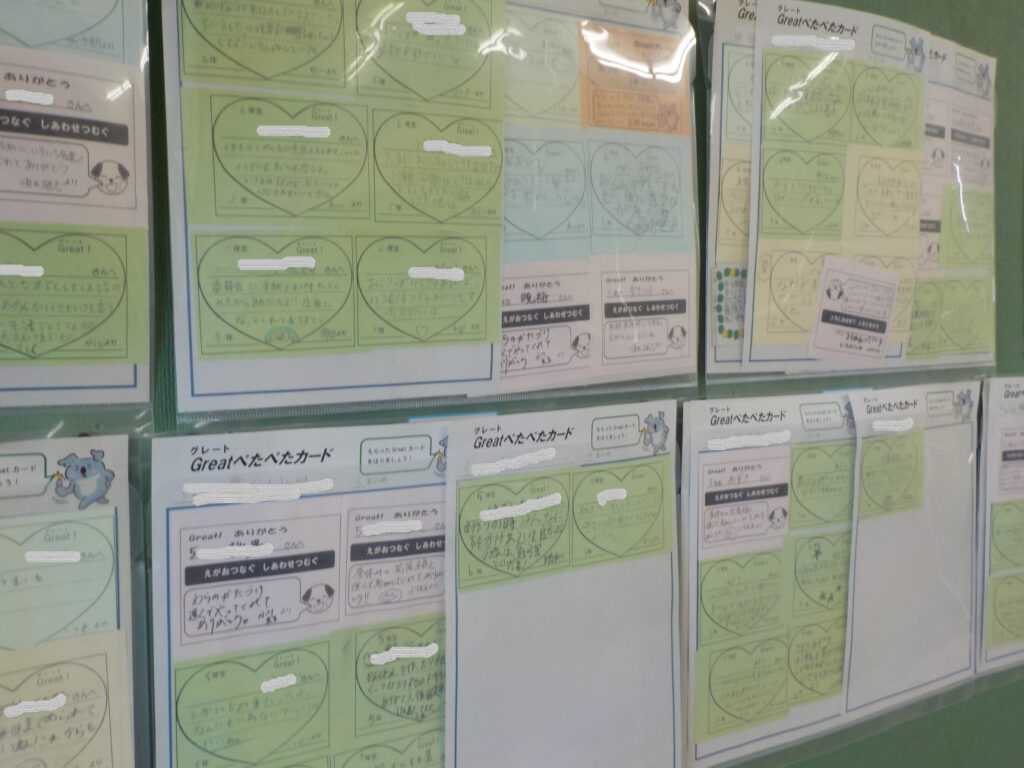 テストが終わった6年生が、友だちからもらったグレイトカードを整理していました。友だちの良いところを見つけてグレイトカードに記入して友だちに渡す活動を進めてきました。教室の掲示を見ると、たくさんもらっている子どもは、整理しているシートが7枚以上にもなっていました。もらったカードをみて、自分のよさに気づいたり、自分の良いところをわかってくれている友だちの大切さを感じたりできるとよいですね。
