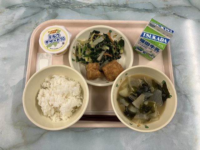 ご飯、じゃがいもの味噌汁、厚揚げのゴマだれかけ、じゃこあえ、ミルクデザート、牛乳 でした。