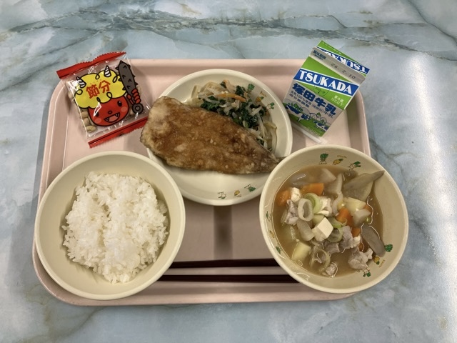 ご飯、豚汁、鰯の蒲焼、ツナ和え、おやつ大豆、牛乳 でした。