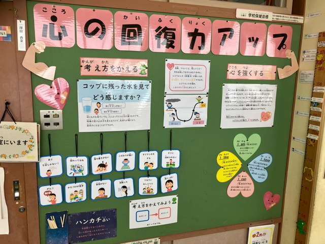 保健室前の掲示が変わりました。「心の回復力アップ」です。考え方を変えて、心が折れないように強くしていこうという内容です。最近では、折れない心を「レジリエンス」と言います。もし、自分にとって良くない出来事が起きたとしても、そこで心が折れるのではなく、それを乗り越えていけるとよいです。そのために、考え方をポジティブにしていくことが大事ですね。それが「しあわせ」につながっていきます。当校の「しあわせスイッチ」では、「なんとかなる!」と言っています。子どもたちには、しなやかで強い折れない心をもてるようになってほしいです。