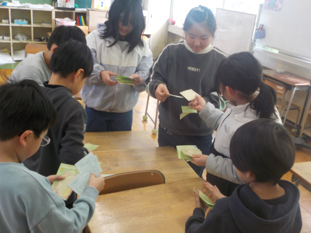 今日の小瀬っ子タイムは、小瀬っ子班遊びの最終回でした。班ごとに分かれて、鬼ごっこやドッジボール、クイズなどで楽しく遊んだり、友だちのよさを見つけて書いたグレイトカードを交換したりしました。「来年も同じ班になったらよろしくね!」などと、言葉を交わしながらカード交換した子どもたち。もらったカードを読みながら笑顔になっていました。