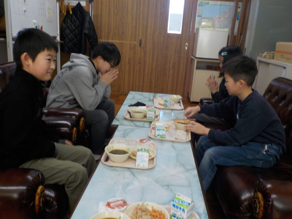 火曜日は校長室ランチです。4人の子どもたちが校長室に集まりました。今日の給食の献立は子どもたちに人気で、「すごく美味しい!」と言って、みんな残さずに食べていました。習い事などの話題で盛り上がりました。楽しいランチになりました。