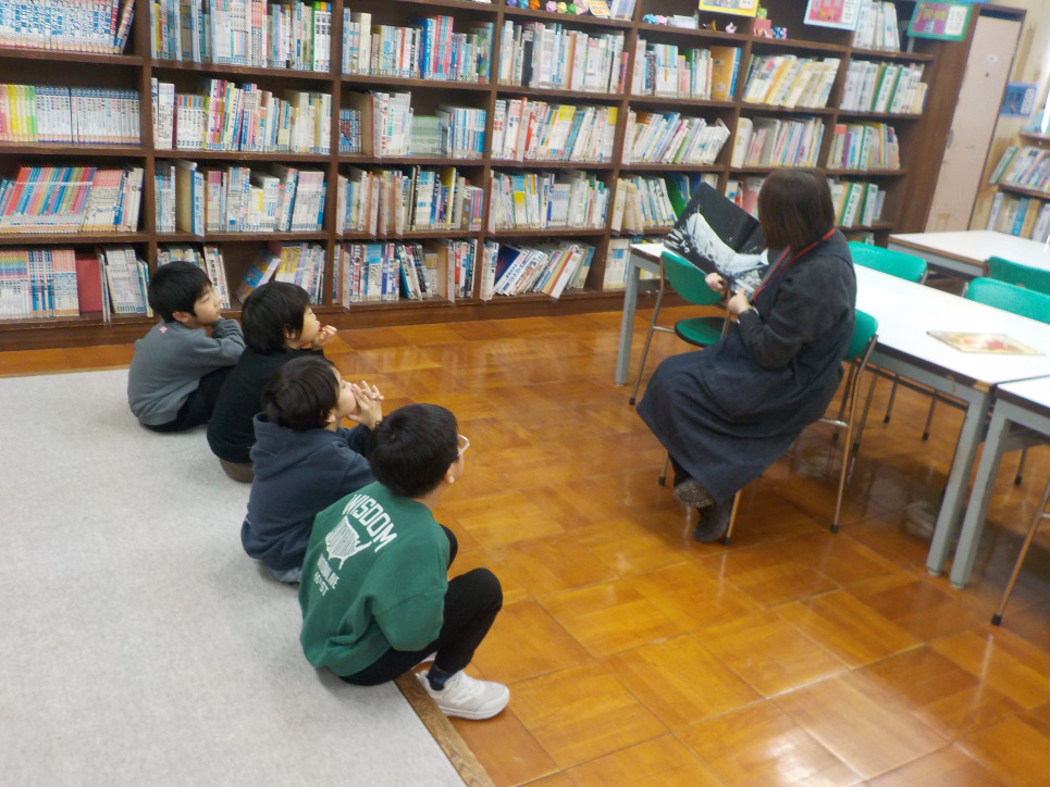 1年生は、図書館で司書の読み聞かせを聴きました。「クジラがしんだら」という本です。図鑑が好きな子どもたちは、食い入るように話を聴いていました。