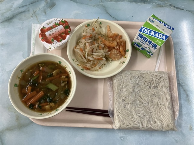 大麦麺、カレー南蛮、えびのから揚げ、ゴマ入り大根漬け、いちごゼリー、牛乳 でした。
